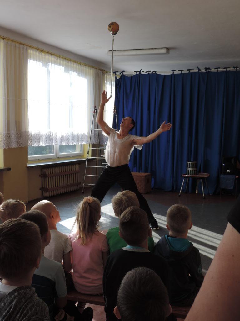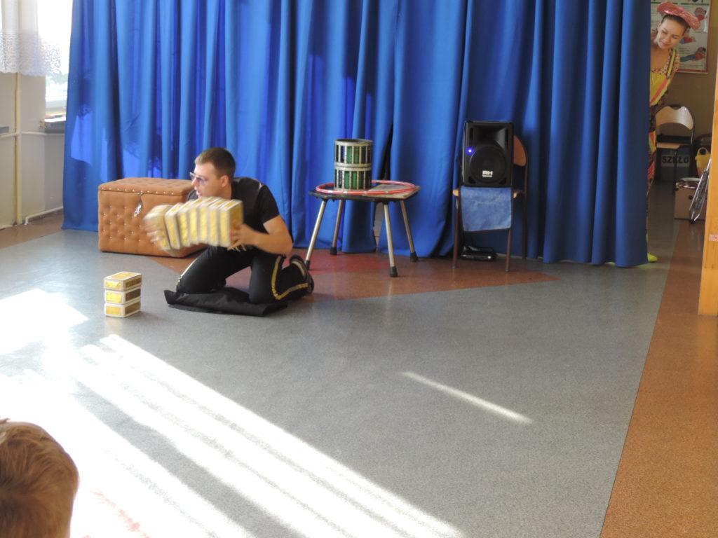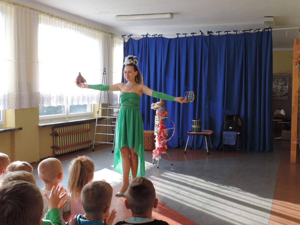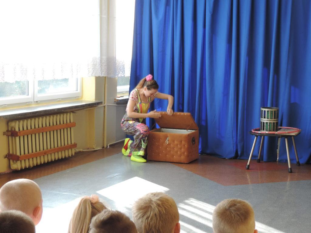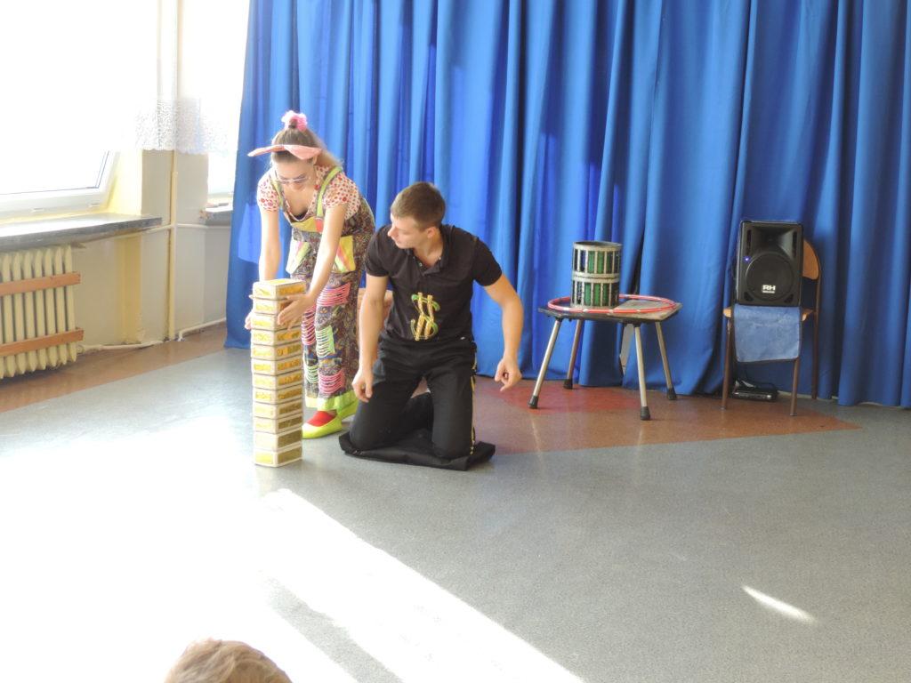 Wszystkim zgromadzonym dopisywał dobry humor, o który dbał wesoły klown. W czasie kilkudziesięciominutowego występu uczniowie nie tylko podziwiali sztuczki cyrkowe, ale mieli możliwość pojawienia się na scenie i brać czynny udział w realizacji wielu z nich. Zapierającą dech w piersiach chwilą był moment pojawienia się artystki z wężem na rękach, którego każdy mógł dotknąć. Wielkie brawa za odwagę należą się pani Jolancie Wojciechowskiej, która pozwoliła sobie położyć węża na ramionach, a także naszym uczniom: Zuzannie Zamożniewicz, Oliwii Karólewskiej, Agacie Sznajder, Weronice Gutowskiej, Natalii Dziubie, Marcie Jarudze oraz dla Patryka Wychowałka, Fabiana Jęcka, Kacpra Lenarta, Dominika Wojciechowskiego, Daniela Piątka, a także Janka Michniaka - za trzymanie węża na rękach.