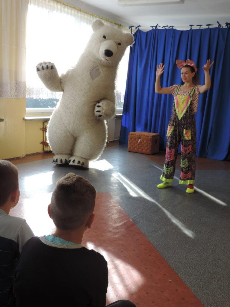 Cały pokaz zakończył uroczy występ misia polarnego. a uczniowie pożegnali cyrkowców gromkimi brawami.