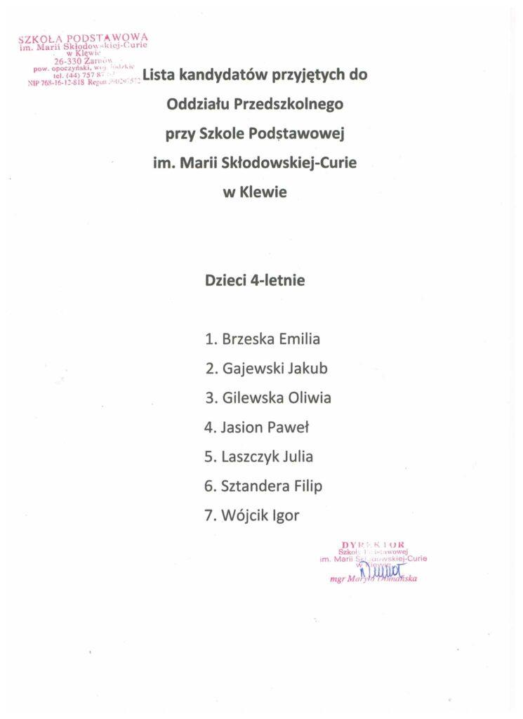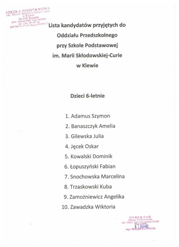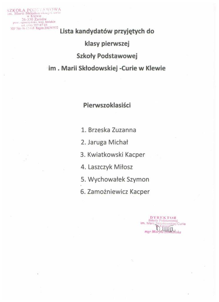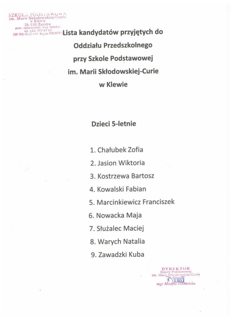 Dyrektor Szkoły Podstawowej im. Marii Skłodowskiej-Curie w Klewie przedstawia wyniki naboru do klasy I oraz Oddziału Przedszkolnego na rok szkolny 2021/2022: