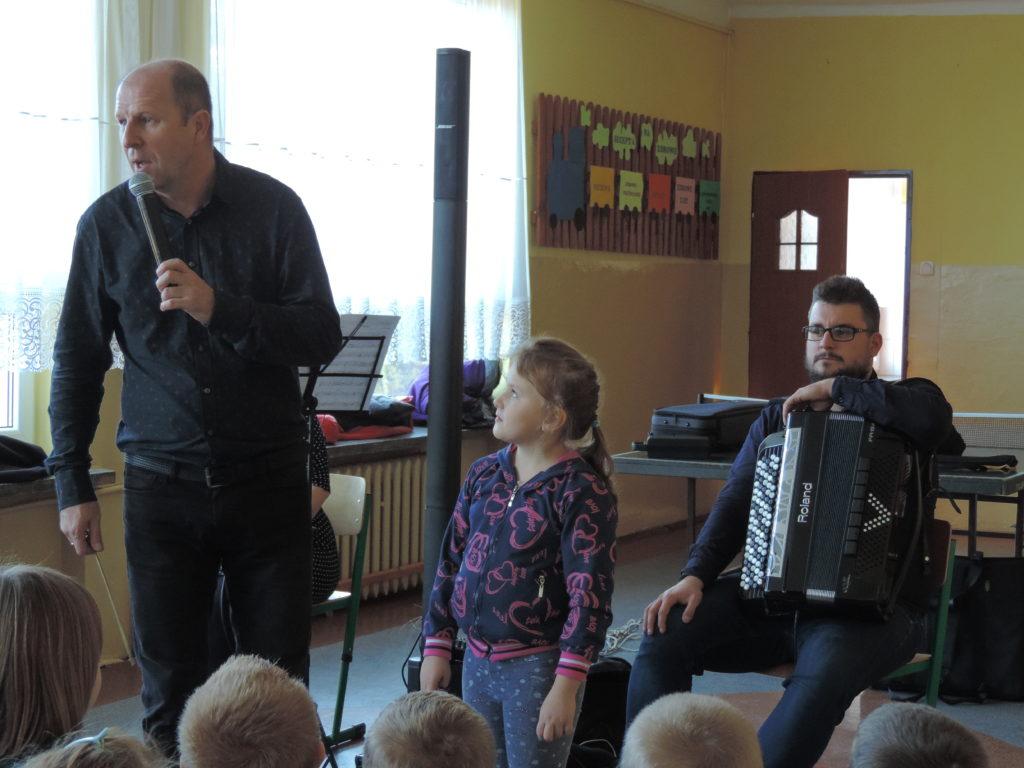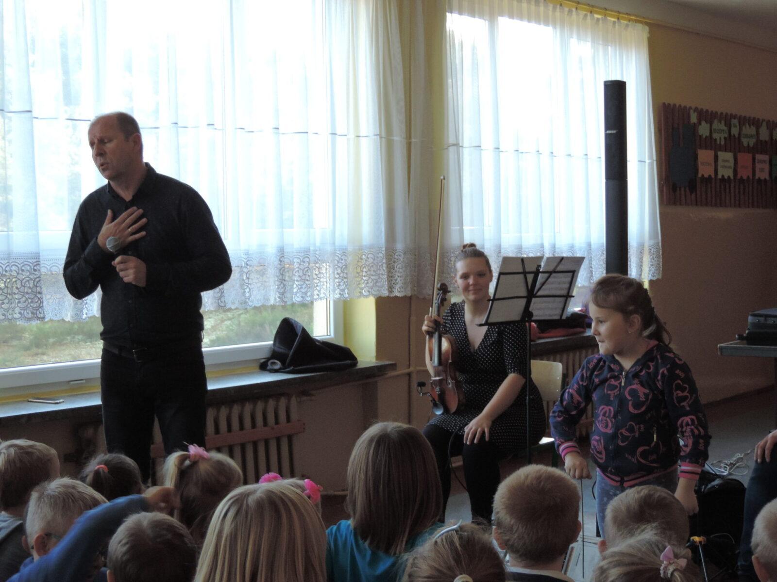 Spotkania z muzyką, organizowane cyklicznie w naszej szkole przybliżają dzieciom świat dźwięków, pobudzają uwagę słuchową, prezentują bogate instrumentarium, przedstawiają różne rodzaje tańców.