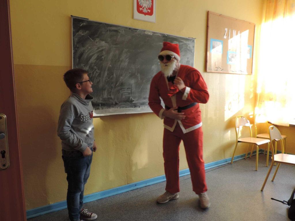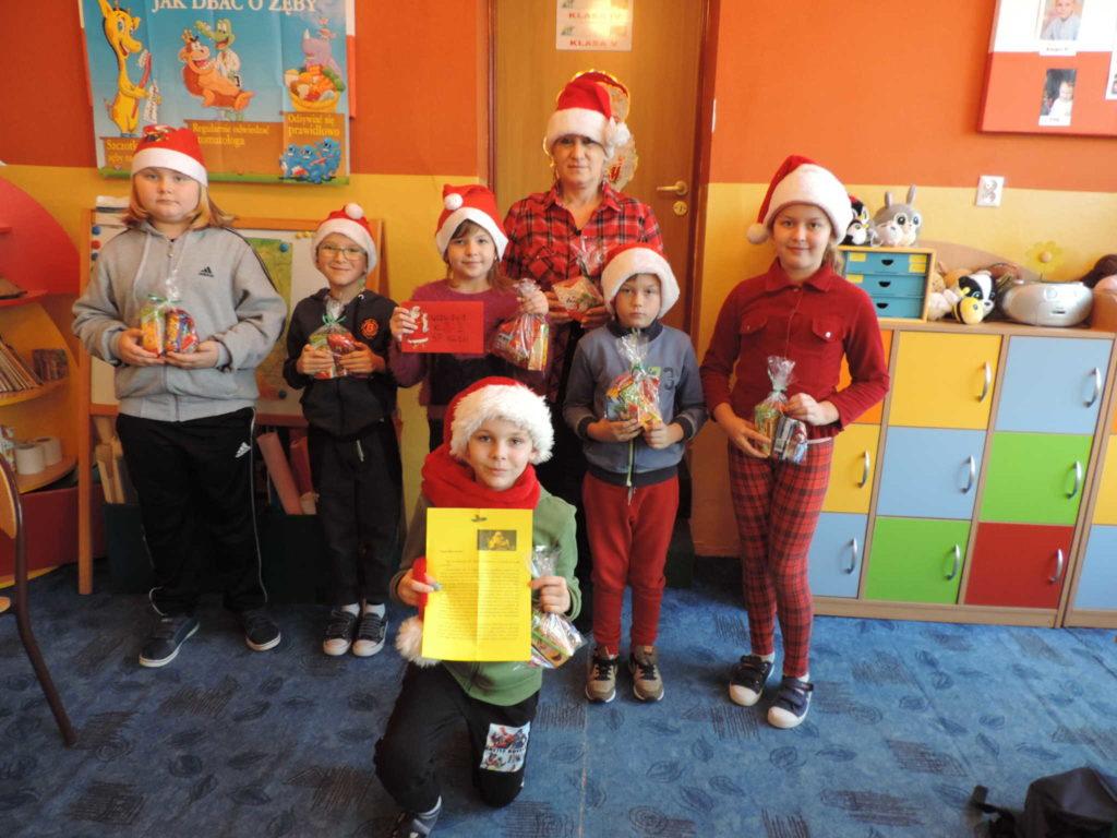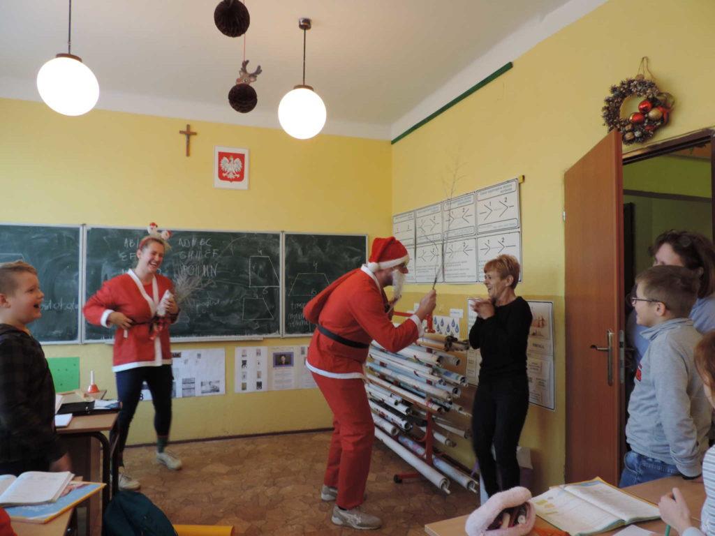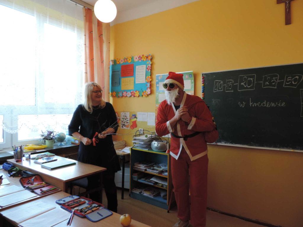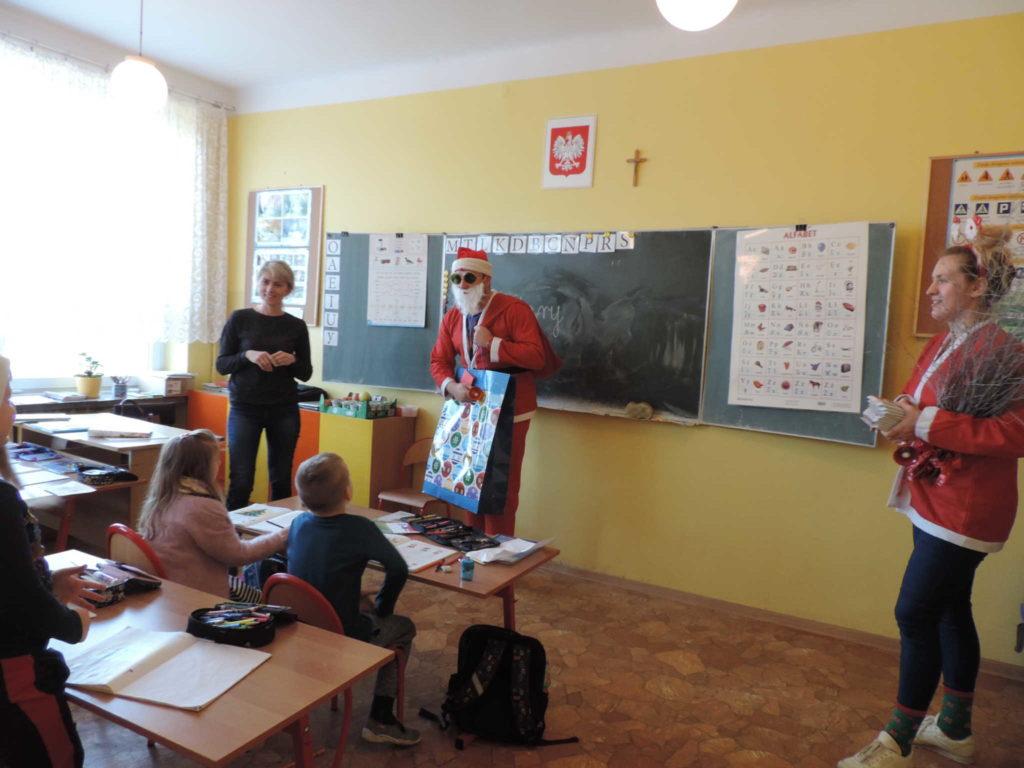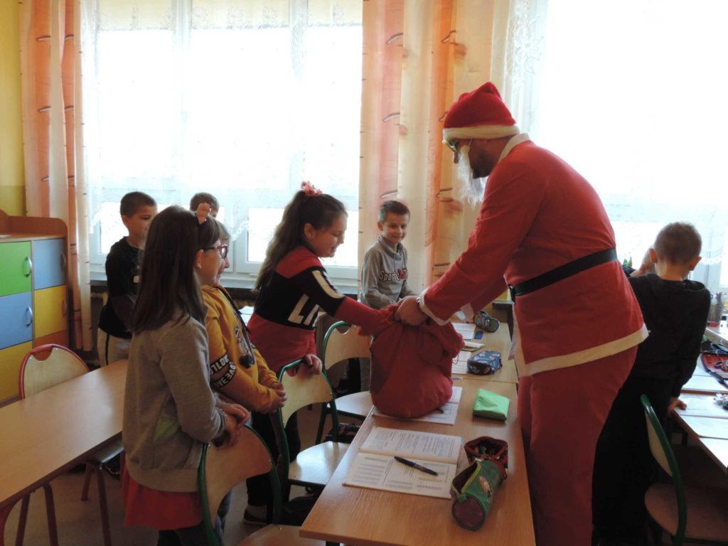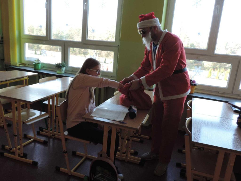 6 grudnia jest dniem imienin Mikołaja. Od samego rana można było dostrzec uczniów i nauczycieli ubranych na czerwono lub w pięknych mikołajkowych czapkach. Jaka była radość, gdy do szkoły zawitał nie kto inny jak Święty Mikołaj! Dzieci i nauczycieli witali gościa z ogromnym entuzjazmem. W podzięce za przyniesione prezenty najmłodsi zaśpiewali Mikołajowi piosenkę oraz wykonali piękne portrety przy pomocy waty. Mikołaj i Śnieżynka nie zapomnieli również o starszych uczniach, z pomocą grona pedagogicznego przygotowali dla grzecznych uczniów i nauczycieli słodką niespodziankę. Nie obyło się również bez rózg dla tych mniej grzecznych. Każdy tego dnia był uśmiechnięty i miał dobry mikołajkowy humor. Kto wie, może Mikołaj odwiedzi nas również za rok?